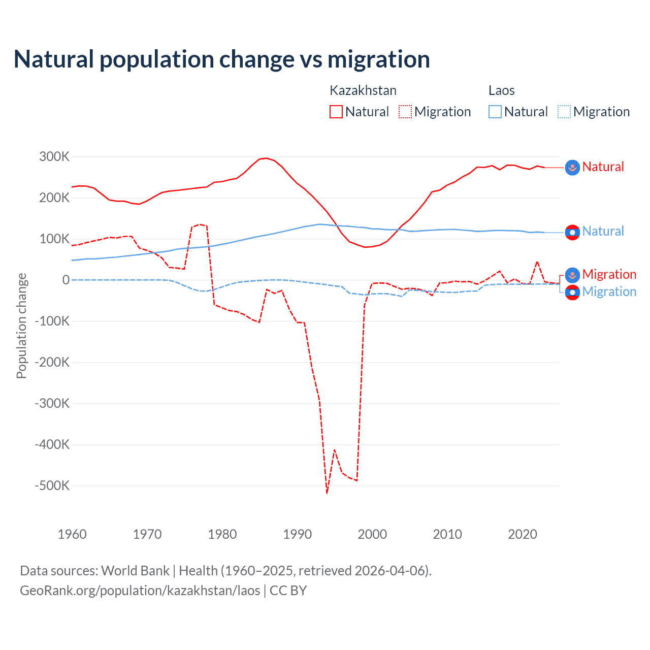 Over the last 10 years, 98.7% of the population change in Kazakhstan is from natural causes (a gain of 2,743,094 people) and 1.33% is from migration (a gain of 36,908 people). In Laos 90.6% is from natural causes (a gain of 1,183,013 people) and 9.41% is from migration (a loss of 122,899 people).