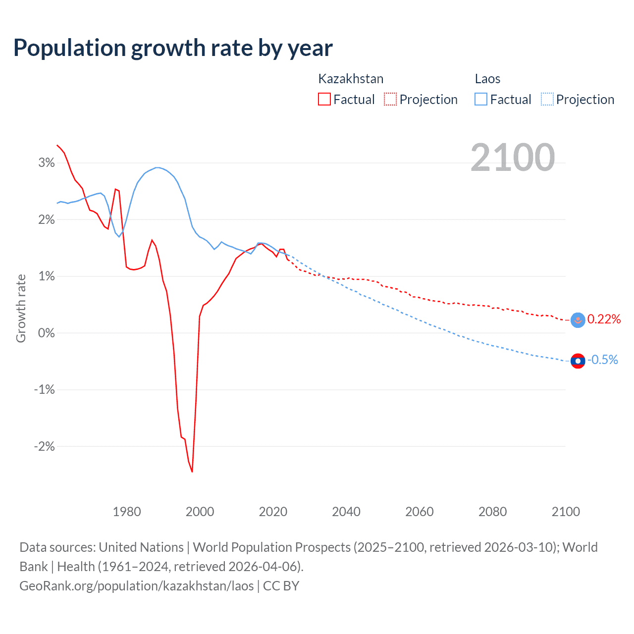 - For the last 10 years, Kazakhstan has had an average growth rate of +1.46% per year vs +1.48% in Laos.