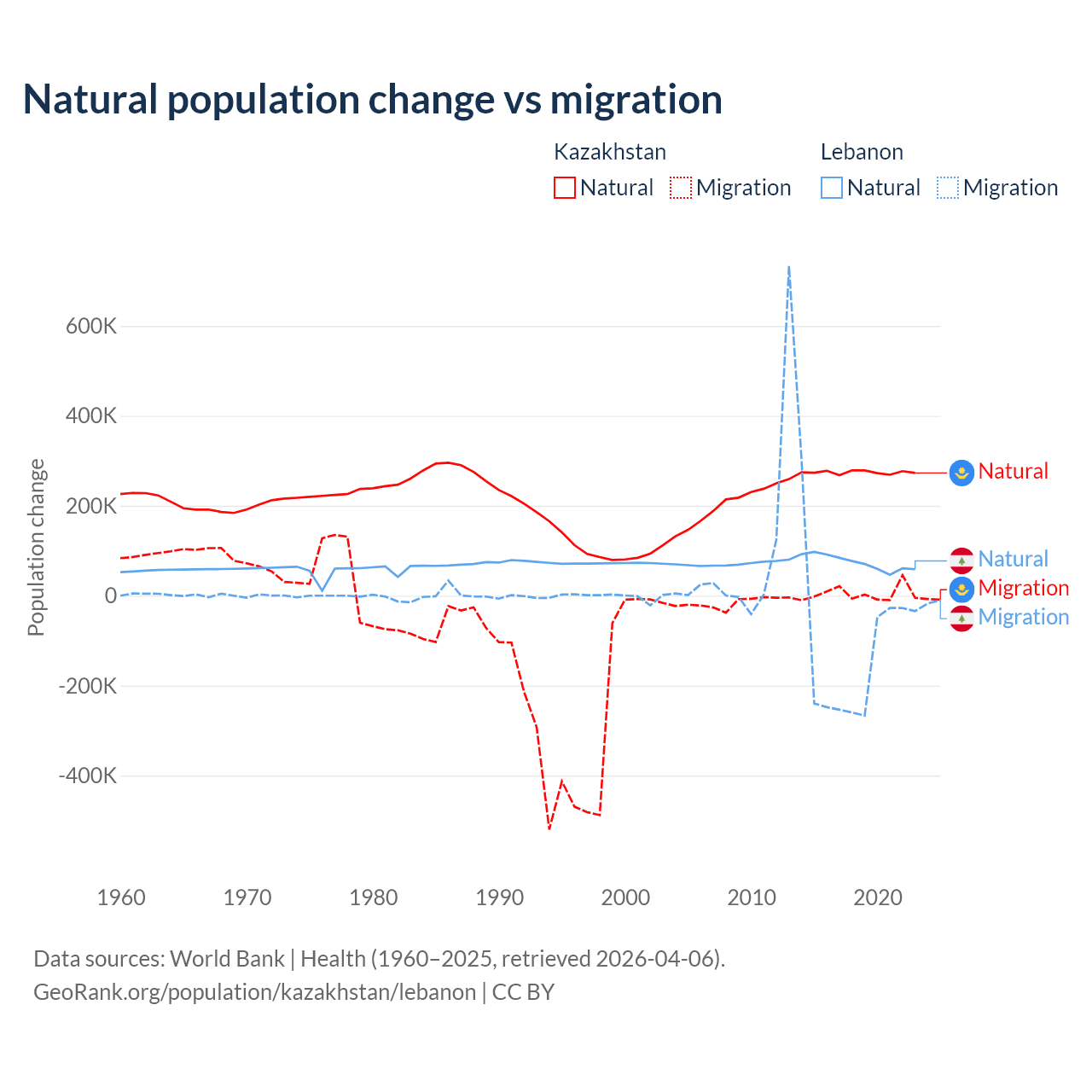 Over the last 10 years, 98.7% of the population change in Kazakhstan is from natural causes (a gain of 2,743,094 people) and 1.33% is from migration (a gain of 36,908 people). In Lebanon 40.1% is from natural causes (a gain of 739,256 people) and 59.9% is from migration (a loss of 1,103,772 people).