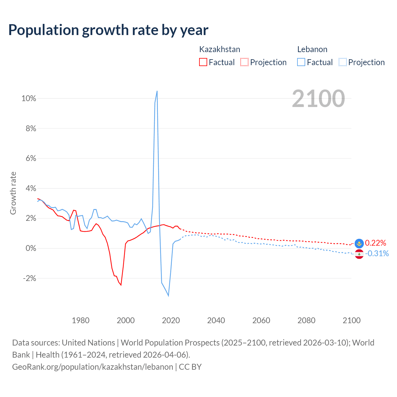 - For the last 10 years, Kazakhstan has had an average growth rate of +1.46% per year vs +0.16% in Lebanon.