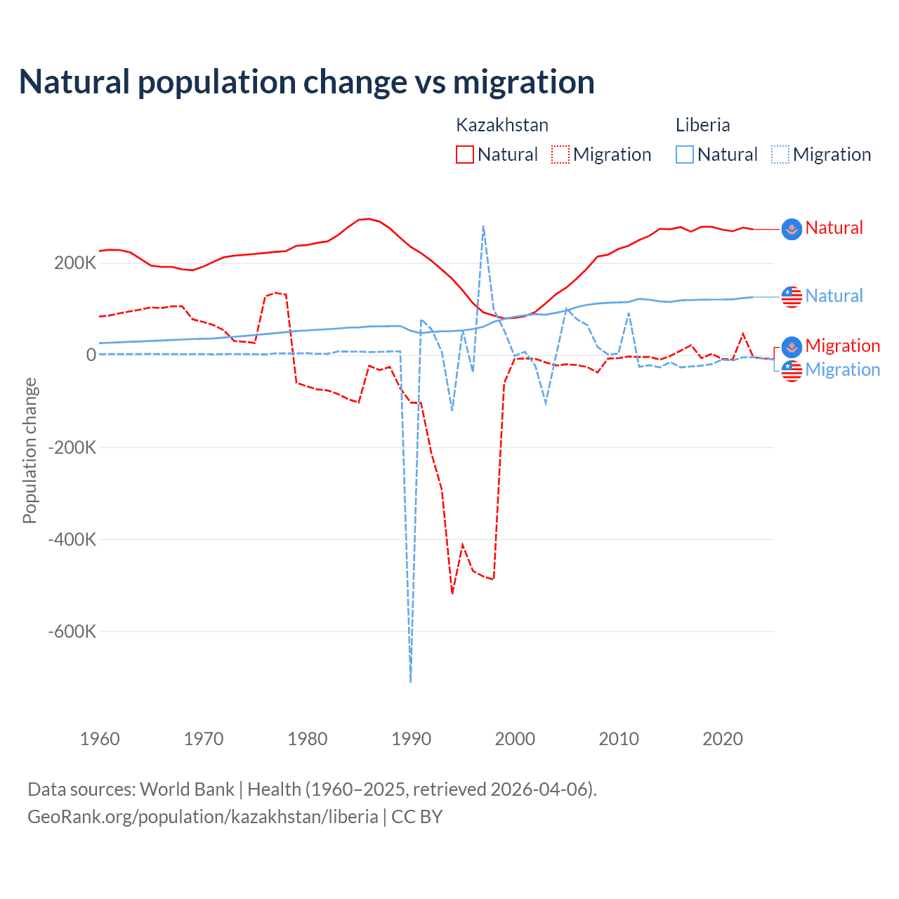 Over the last 10 years, 98.7% of the population change in Kazakhstan is from natural causes (a gain of 2,743,094 people) and 1.33% is from migration (a gain of 36,908 people). In Liberia 87.7% is from natural causes (a gain of 1,202,387 people) and 12.3% is from migration (a loss of 168,316 people).