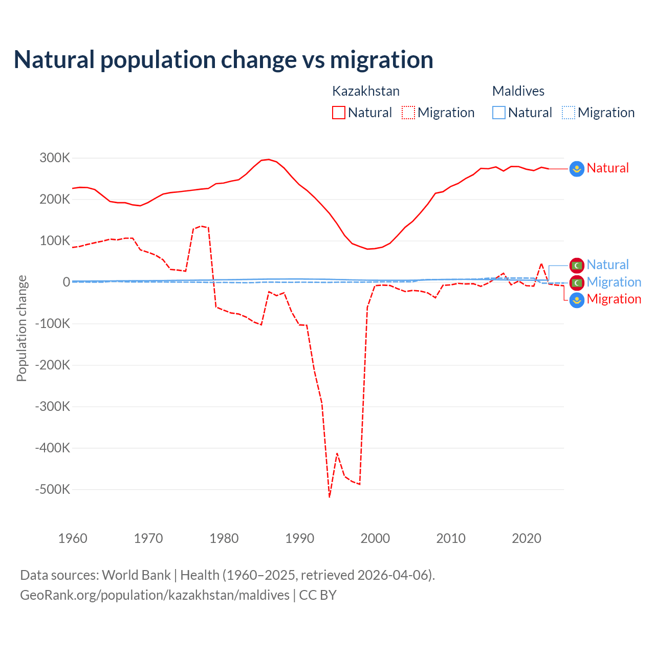 Over the last 10 years, 98.7% of the population change in Kazakhstan is from natural causes (a gain of 2,743,094 people) and 1.33% is from migration (a gain of 36,908 people). In Maldives 42.7% is from natural causes (a gain of 51,342 people) and 57.3% is from migration (a gain of 68,788 people).