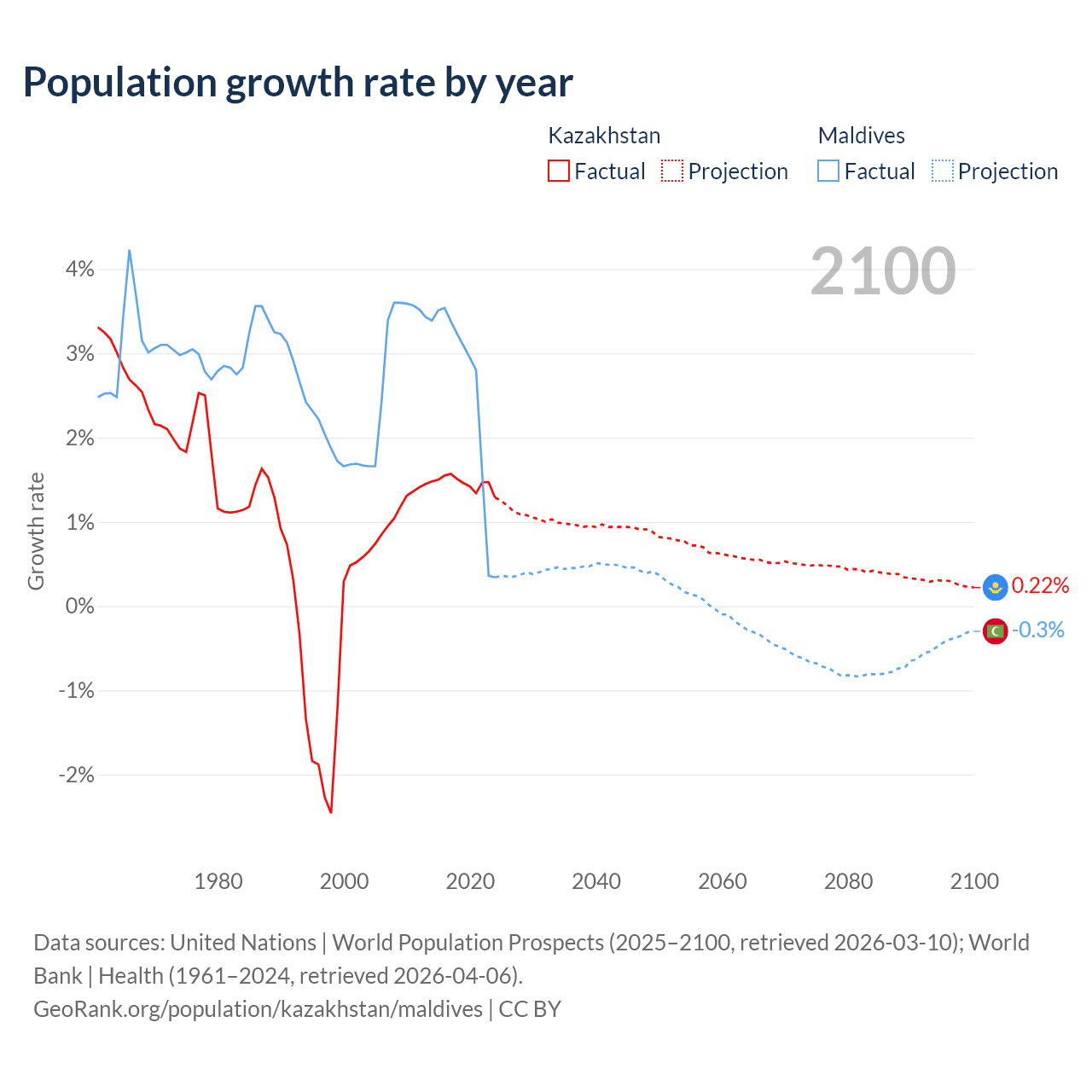 - For the last 10 years, Kazakhstan has had an average growth rate of +1.46% per year vs +2.56% in Maldives.