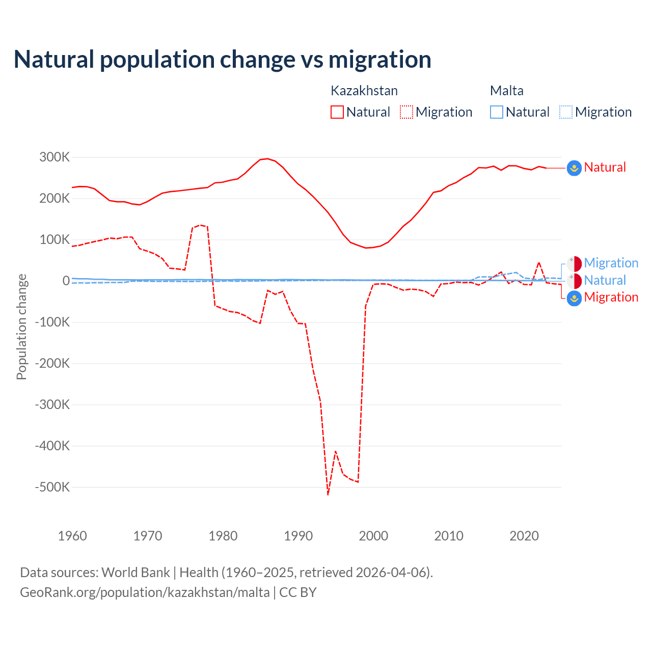 Over the last 10 years, 98.7% of the population change in Kazakhstan is from natural causes (a gain of 2,743,094 people) and 1.33% is from migration (a gain of 36,908 people). In Malta 5.84% is from natural causes (a gain of 6,181 people) and 94.2% is from migration (a gain of 99,652 people).