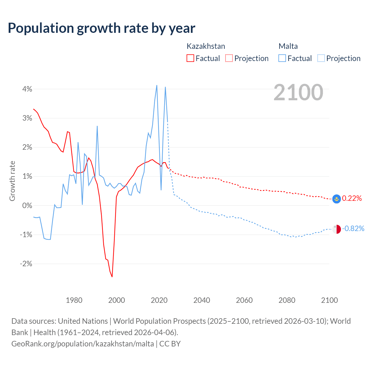 - For the last 10 years, Kazakhstan has had an average growth rate of +1.46% per year vs +2.69% in Malta.
