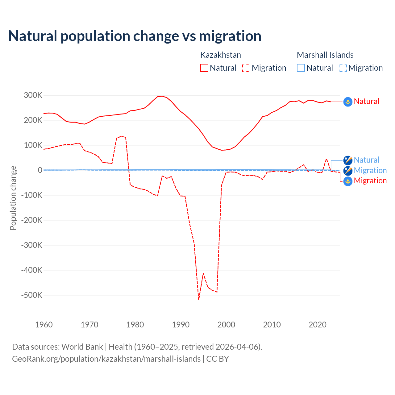 Over the last 10 years, 98.7% of the population change in Kazakhstan is from natural causes (a gain of 2,743,094 people) and 1.33% is from migration (a gain of 36,908 people). In the Marshall Islands 27.8% is from natural causes (a gain of 7,592 people) and 72.2% is from migration (a loss of 19,682 people).