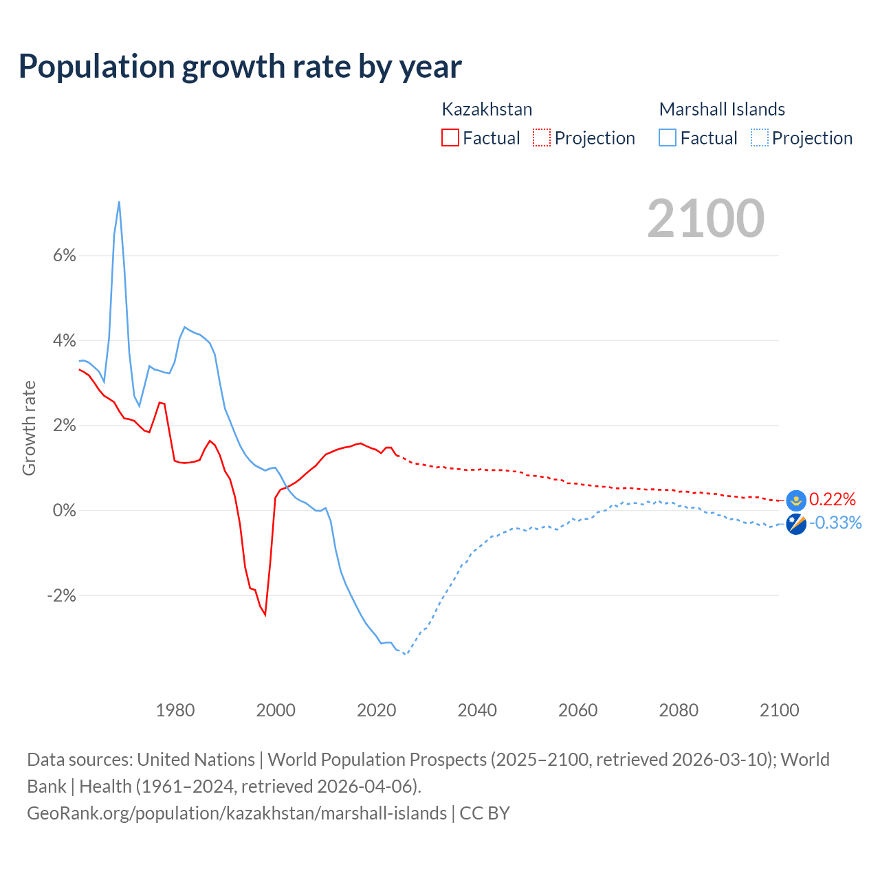 - For the last 10 years, Kazakhstan has had an average growth rate of +1.46% per year vs -2.69% in the Marshall Islands.