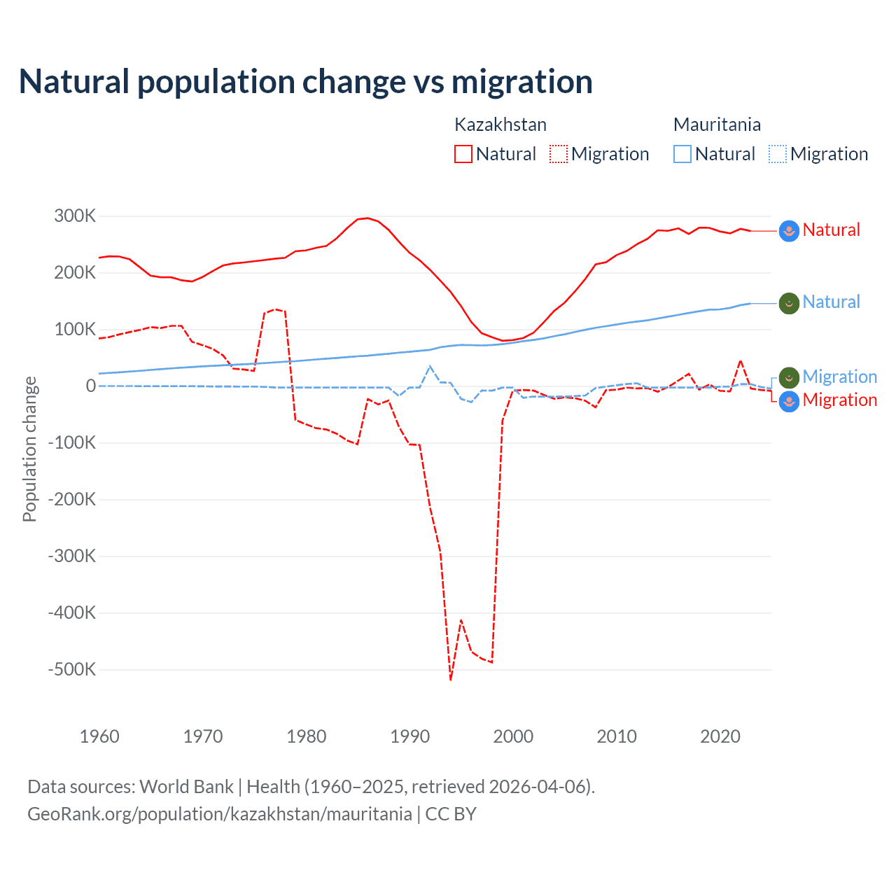 Over the last 10 years, 98.7% of the population change in Kazakhstan is from natural causes (a gain of 2,743,094 people) and 1.33% is from migration (a gain of 36,908 people). In Mauritania 98.9% is from natural causes (a gain of 1,320,903 people) and 1.12% is from migration (a loss of 14,982 people).