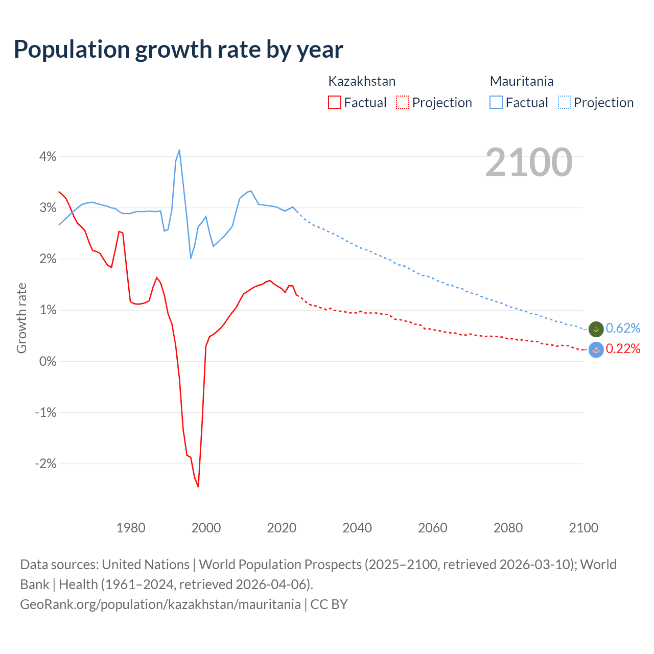 - For the last 10 years, Kazakhstan has had an average growth rate of +1.46% per year vs +3% in Mauritania.