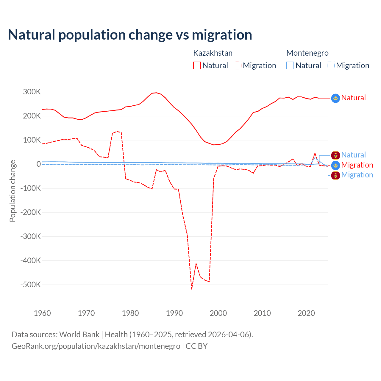 Over the last 10 years, 98.7% of the population change in Kazakhstan is from natural causes (a gain of 2,743,094 people) and 1.33% is from migration (a gain of 36,908 people). In Montenegro 52.4% is from natural causes (a gain of 4,501 people) and 47.6% is from migration (a gain of 4,095 people).