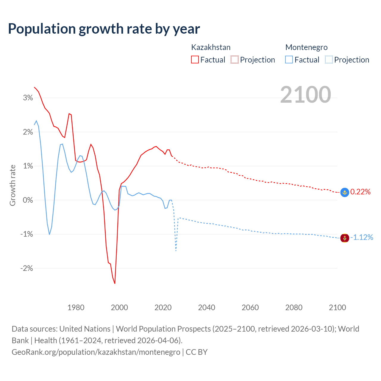 - For the last 10 years, Kazakhstan has had an average growth rate of +1.46% per year vs +0.01% in Montenegro.