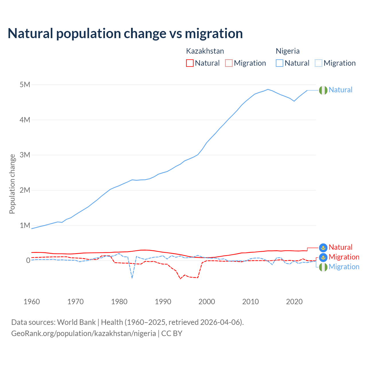 Over the last 10 years, 98.7% of the population change in Kazakhstan is from natural causes (a gain of 2,743,094 people) and 1.33% is from migration (a gain of 36,908 people). In Nigeria 99.2% is from natural causes (a gain of 47,163,517 people) and 0.77% is from migration (a loss of 368,103 people).