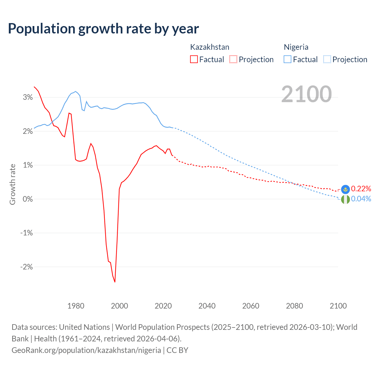 - For the last 10 years, Kazakhstan has had an average growth rate of +1.46% per year vs +2.31% in Nigeria.