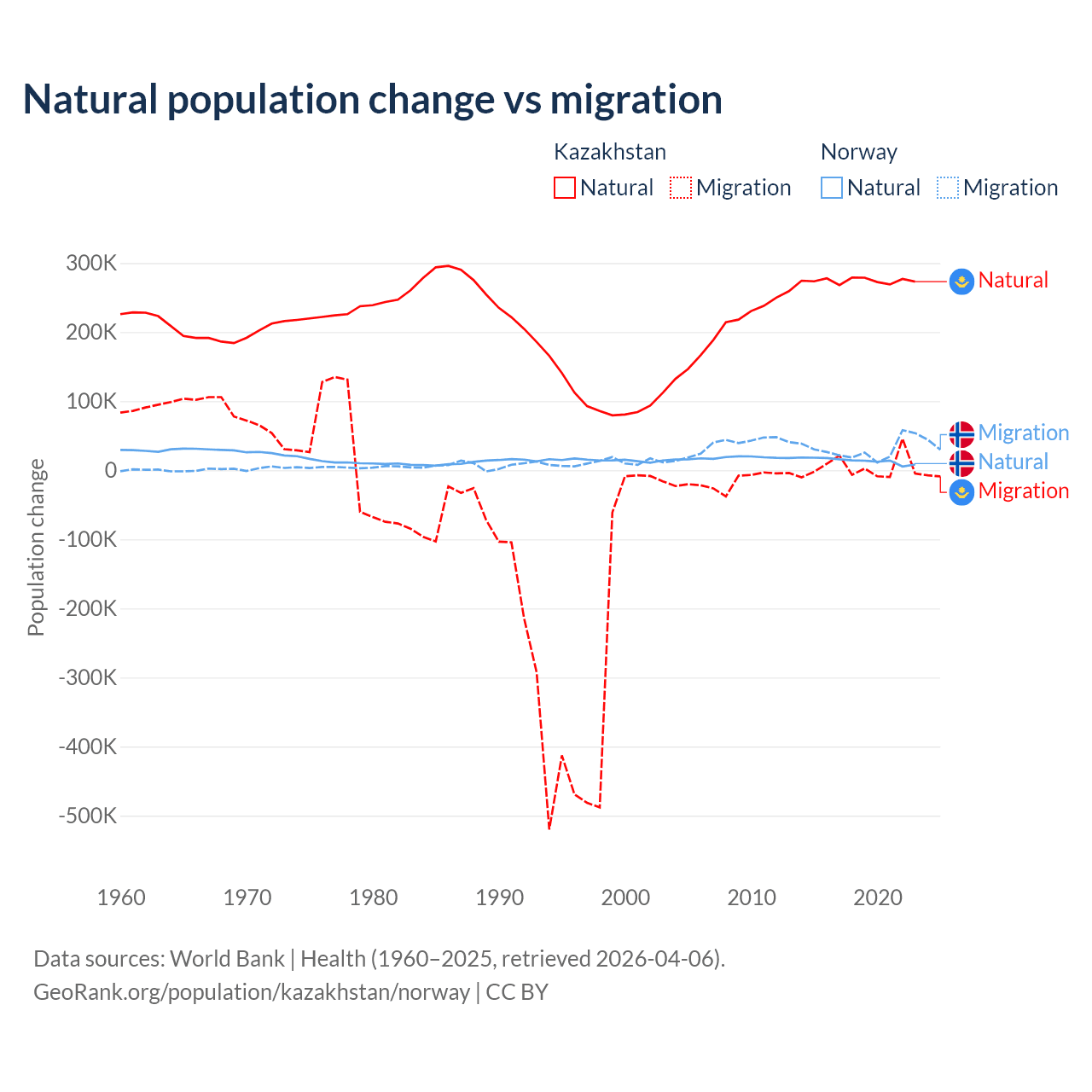 Over the last 10 years, 98.7% of the population change in Kazakhstan is from natural causes (a gain of 2,743,094 people) and 1.33% is from migration (a gain of 36,908 people). In Norway 31.3% is from natural causes (a gain of 138,699 people) and 68.7% is from migration (a gain of 303,945 people).