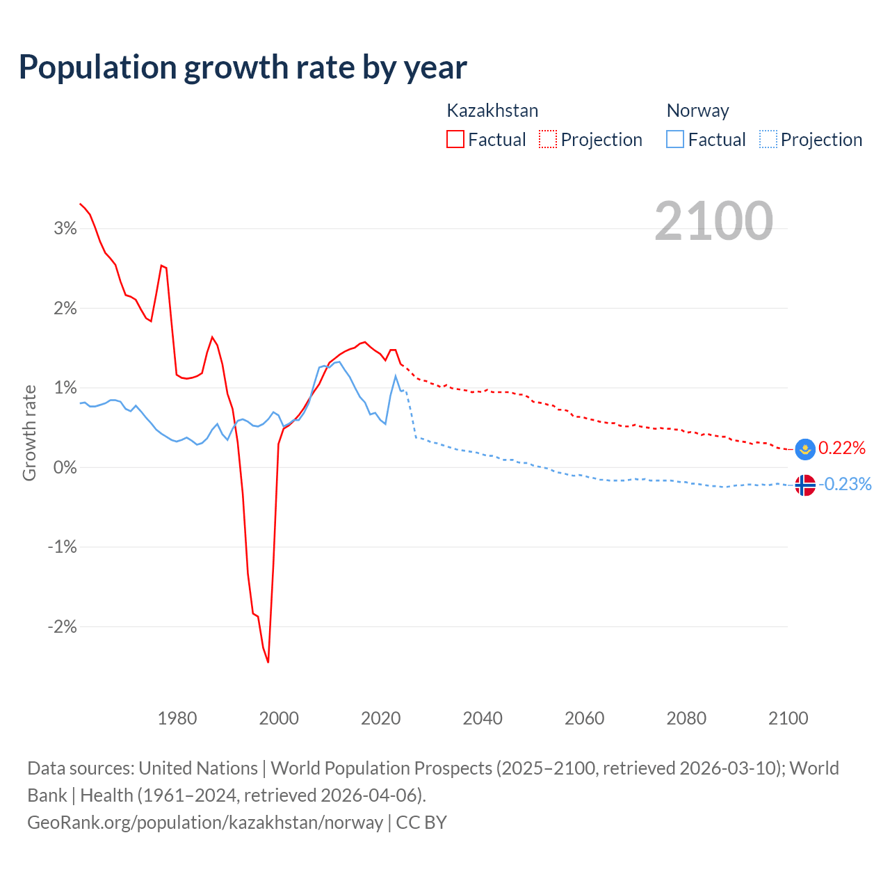 - For the last 10 years, Kazakhstan has had an average growth rate of +1.46% per year vs +0.85% in Norway.