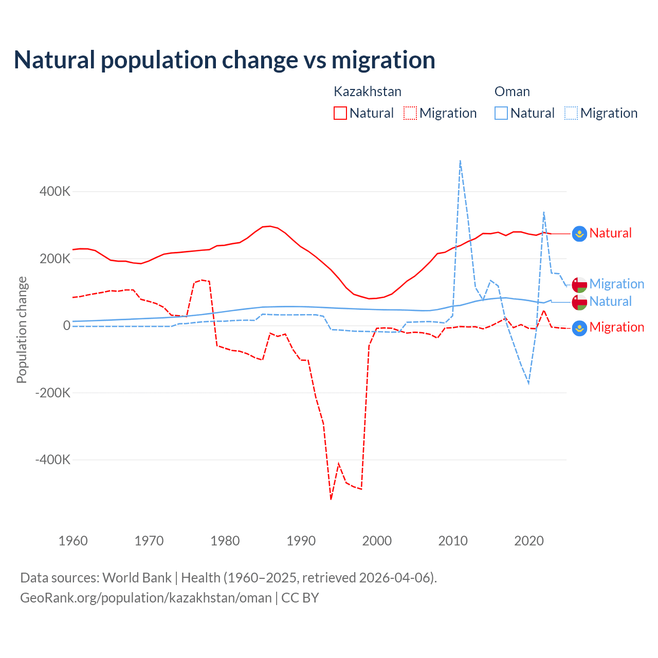 Over the last 10 years, 98.7% of the population change in Kazakhstan is from natural causes (a gain of 2,743,094 people) and 1.33% is from migration (a gain of 36,908 people). In Oman 61.6% is from natural causes (a gain of 763,049 people) and 38.4% is from migration (a gain of 475,565 people).