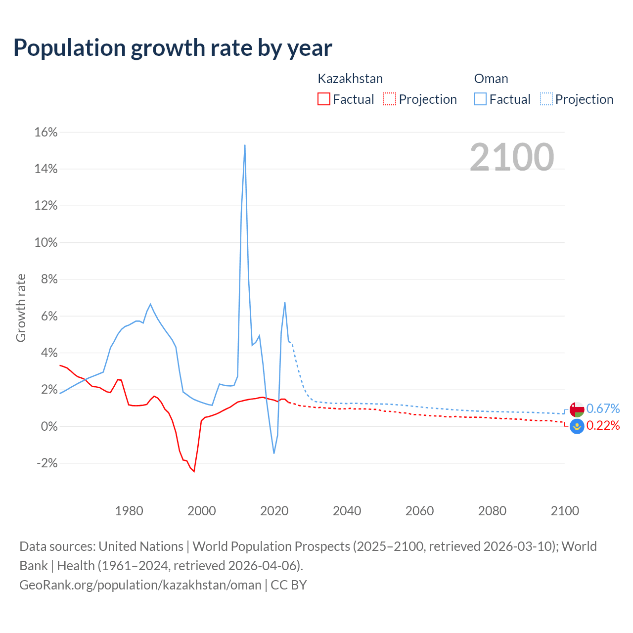 - For the last 10 years, Kazakhstan has had an average growth rate of +1.46% per year vs +2.99% in Oman.