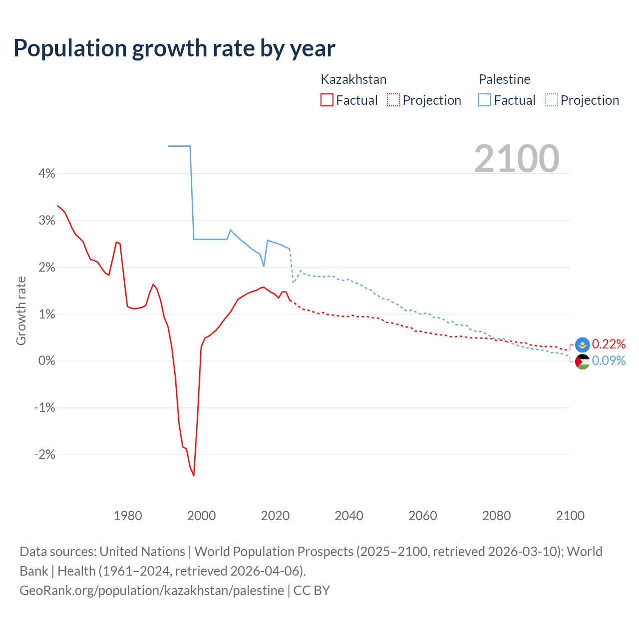 - For the last 10 years, Kazakhstan has had an average growth rate of +1.46% per year vs +2.4% in Palestine.