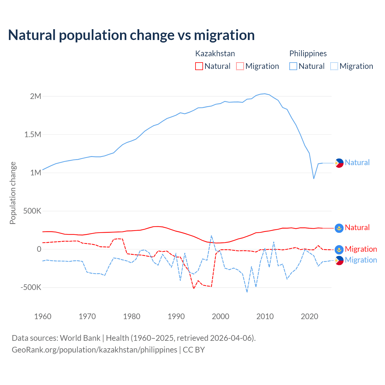 Over the last 10 years, 98.7% of the population change in Kazakhstan is from natural causes (a gain of 2,743,094 people) and 1.33% is from migration (a gain of 36,908 people). In the Philippines 88.5% is from natural causes (a gain of 14,279,705 people) and 11.5% is from migration (a loss of 1,848,117 people).