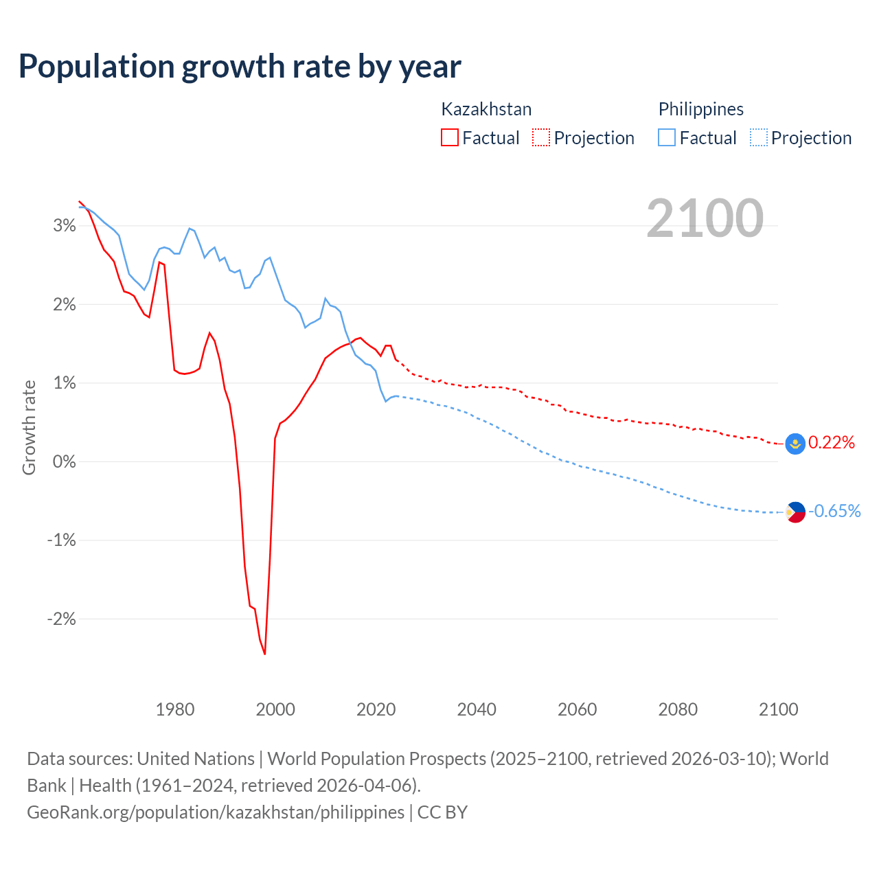- For the last 10 years, Kazakhstan has had an average growth rate of +1.46% per year vs +1.16% in the Philippines.