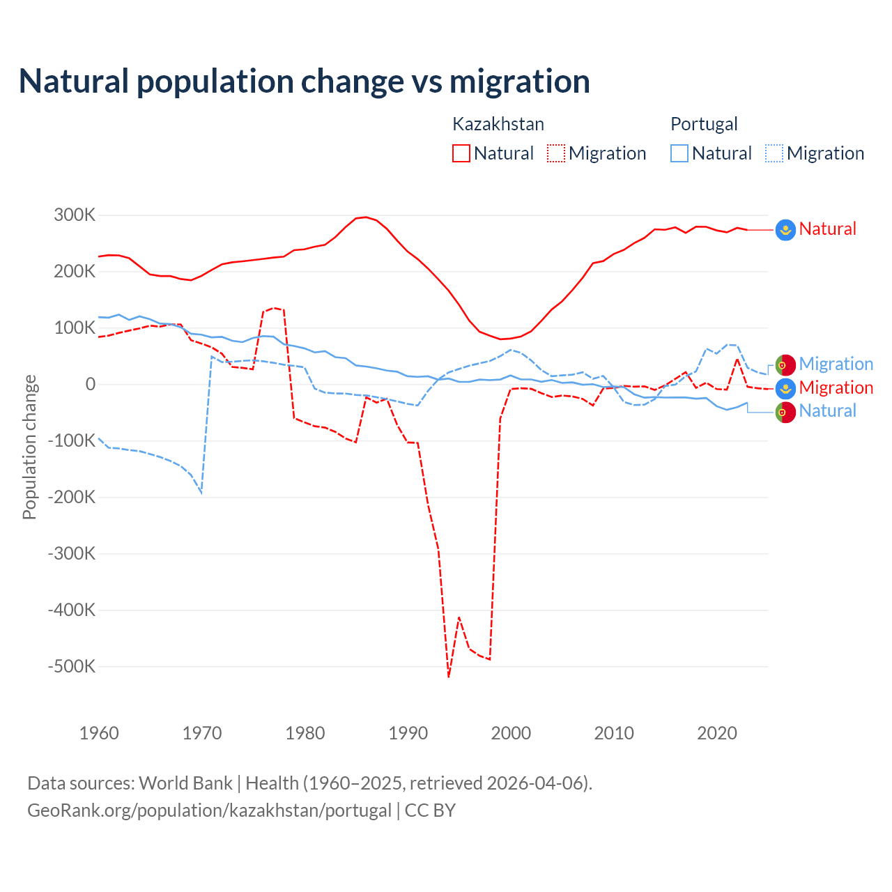Over the last 10 years, 98.7% of the population change in Kazakhstan is from natural causes (a gain of 2,743,094 people) and 1.33% is from migration (a gain of 36,908 people). In Portugal 51% is from natural causes (a loss of 302,748 people) and 49% is from migration (a gain of 290,554 people).