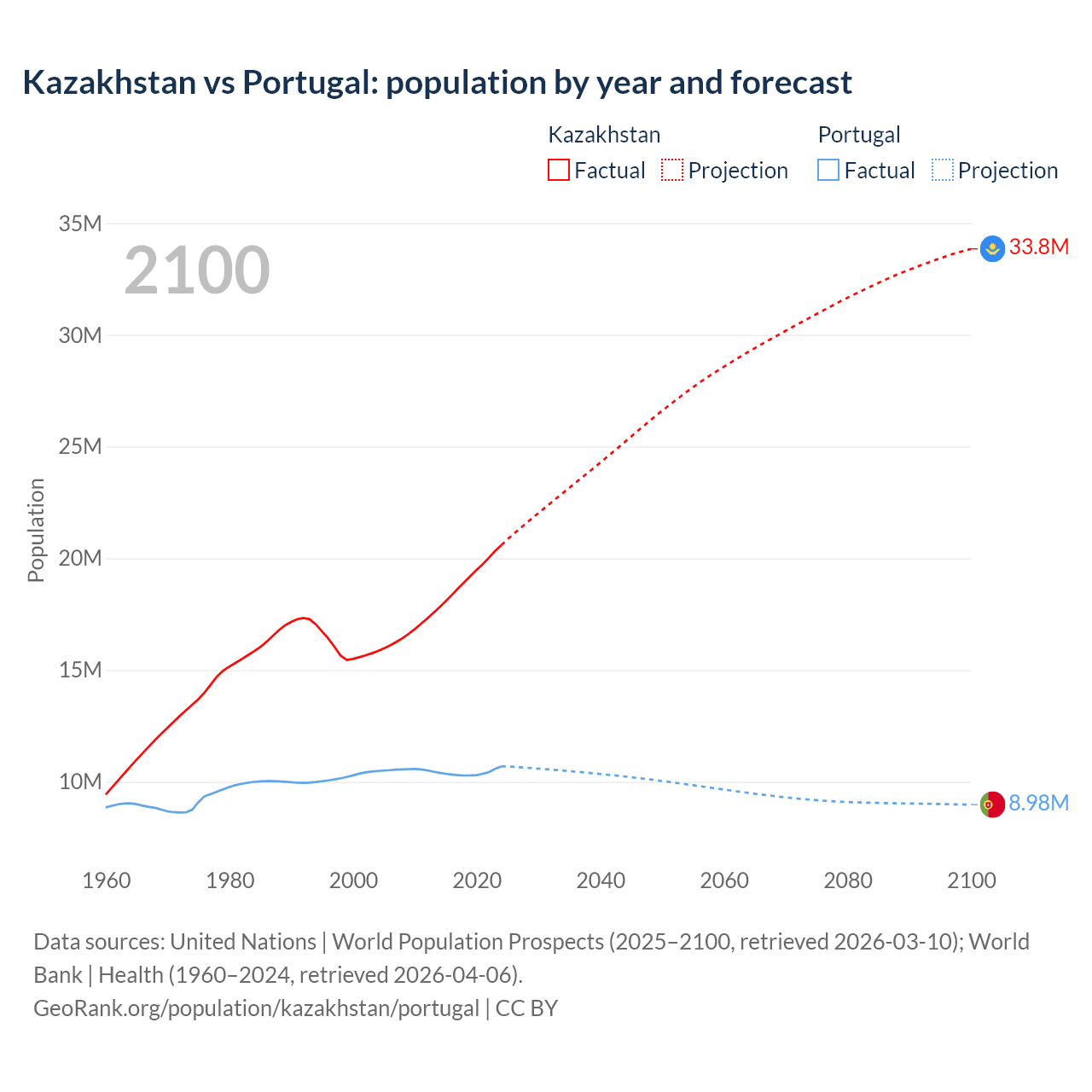 The latest officially reported population of Kazakhstan was 20,592,571 in 2024 vs 10,694,681 people in Portugal in 2024. In 2026, based on the adjusted UN estimation, the current Kazakhstan's population is 21,161,809 people compared to 10,667,081 in Portugal.