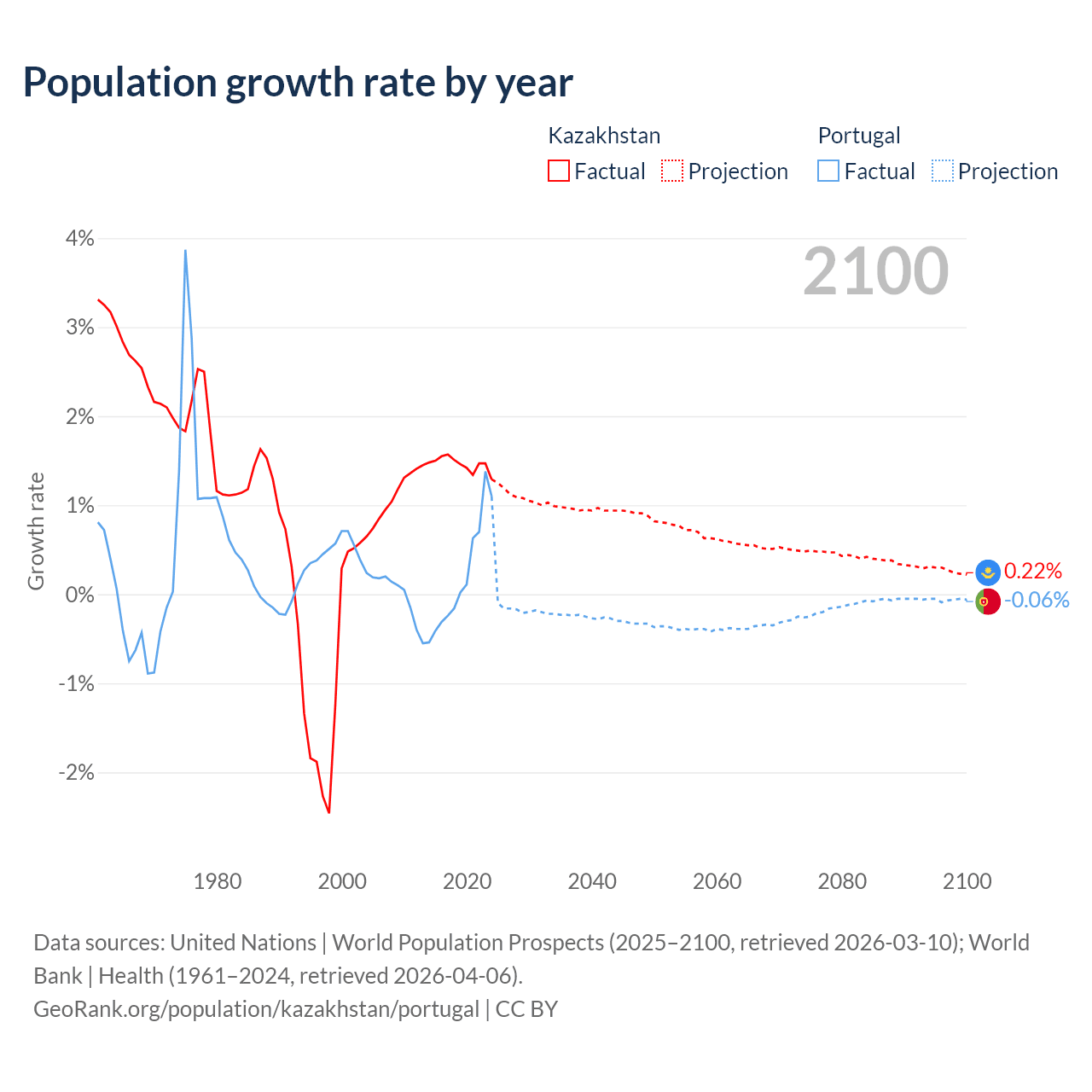 - For the last 10 years, Kazakhstan has had an average growth rate of +1.46% per year vs +0.21% in Portugal.
