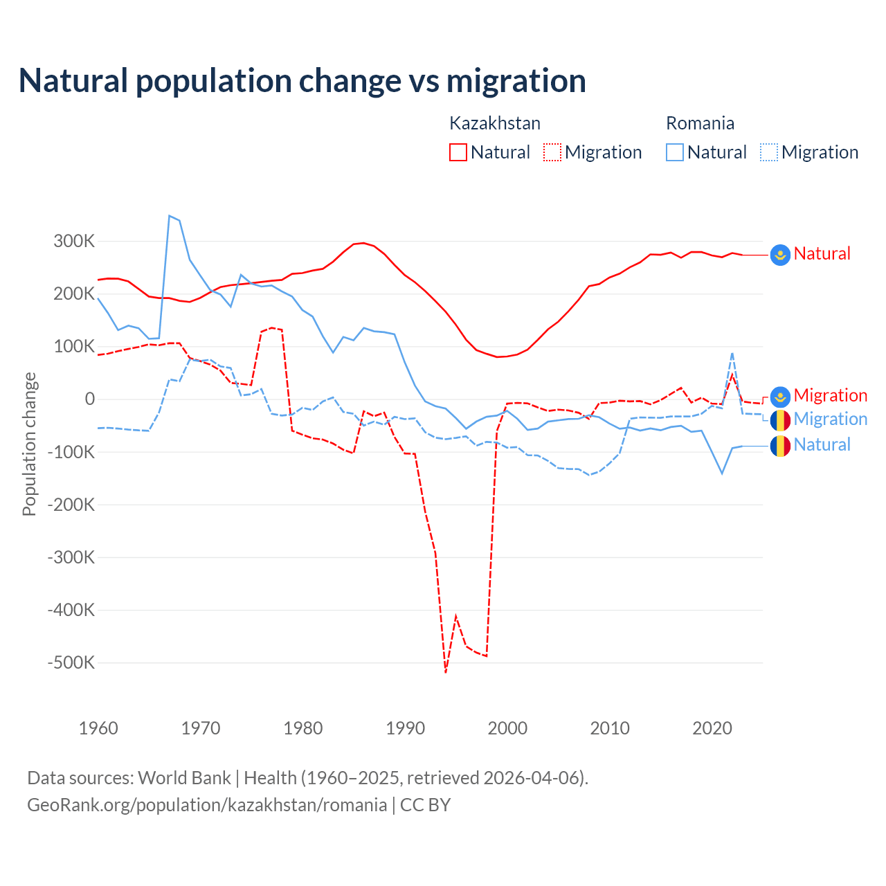 Over the last 10 years, 98.7% of the population change in Kazakhstan is from natural causes (a gain of 2,743,094 people) and 1.33% is from migration (a gain of 36,908 people). In Romania 82% is from natural causes (a loss of 766,295 people) and 18% is from migration (a loss of 167,917 people).