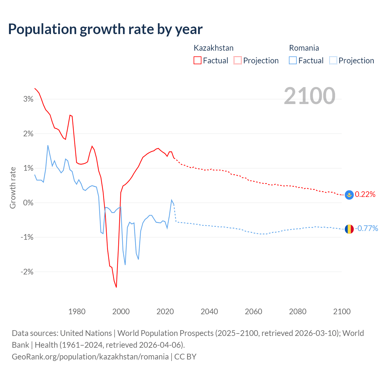 - For the last 10 years, Kazakhstan has had an average growth rate of +1.46% per year vs -0.43% in Romania.