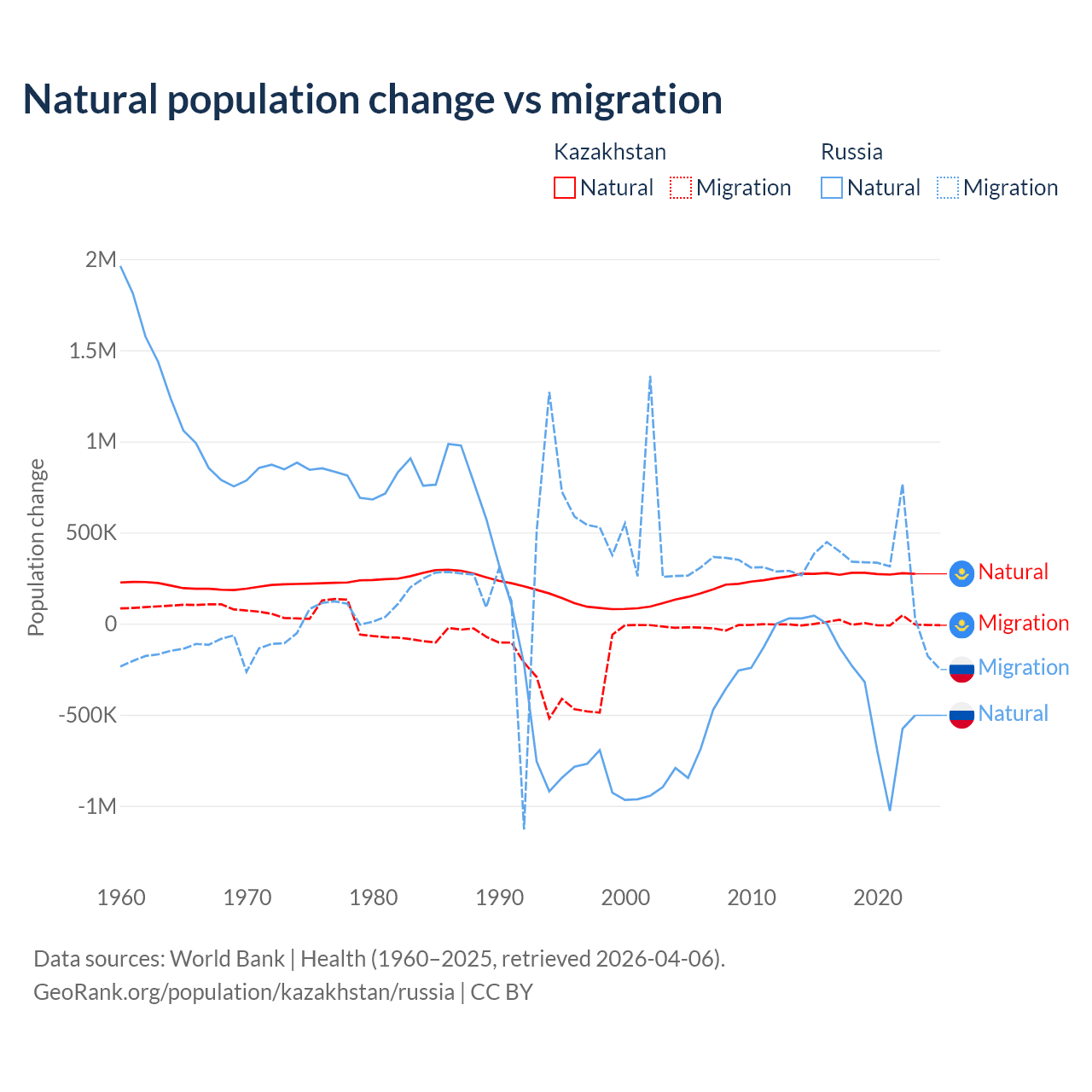 Over the last 10 years, 98.7% of the population change in Kazakhstan is from natural causes (a gain of 2,743,094 people) and 1.33% is from migration (a gain of 36,908 people). In Russia 48.6% is from natural causes (a loss of 3,416,377 people) and 51.4% is from migration (a gain of 3,611,826 people).