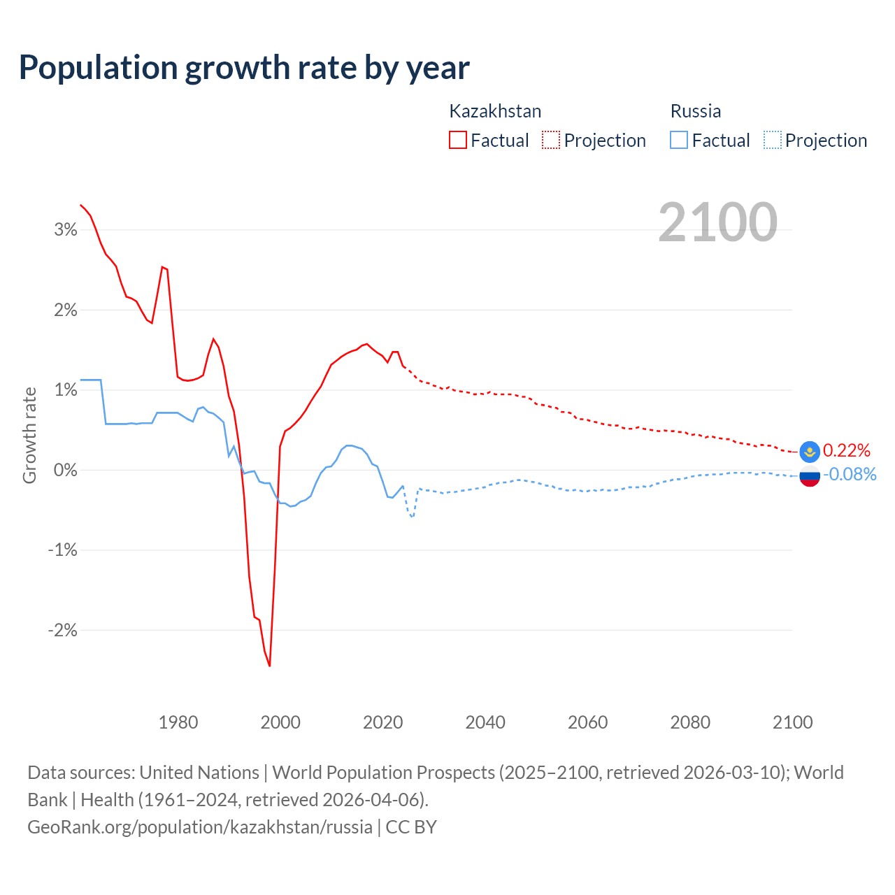 - For the last 10 years, Kazakhstan has had an average growth rate of +1.46% per year vs -0.02% in Russia.