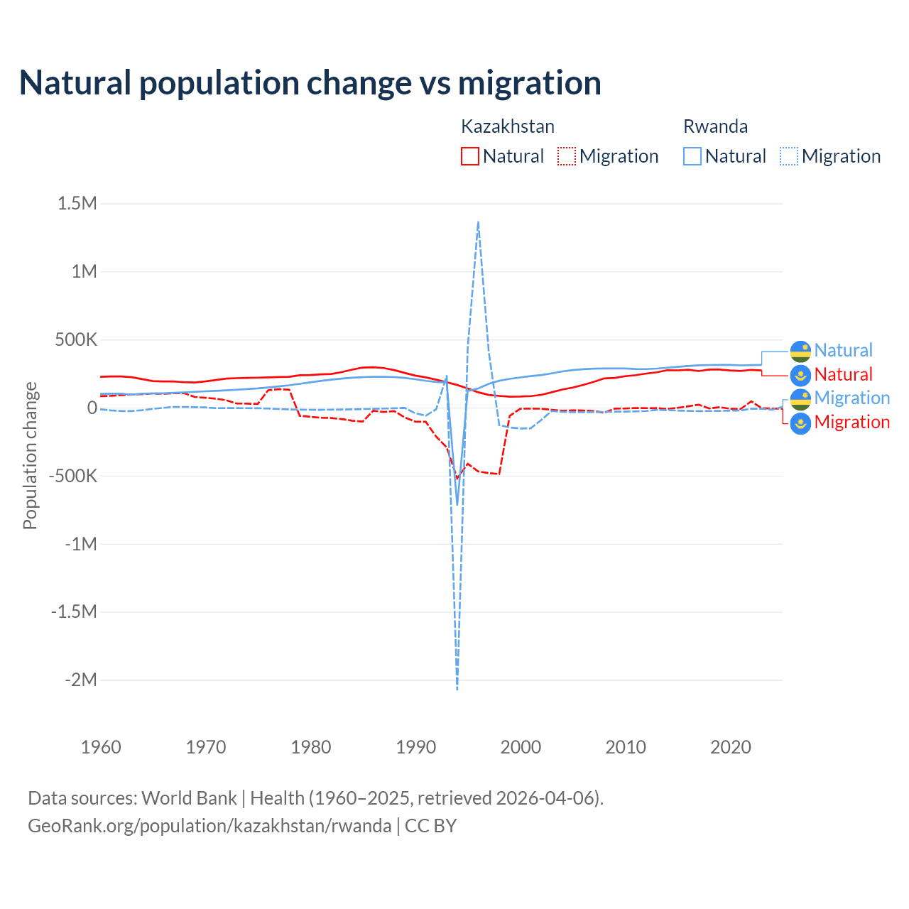 Over the last 10 years, 98.7% of the population change in Kazakhstan is from natural causes (a gain of 2,743,094 people) and 1.33% is from migration (a gain of 36,908 people). In Rwanda 93.8% is from natural causes (a gain of 3,081,296 people) and 6.18% is from migration (a loss of 203,035 people).