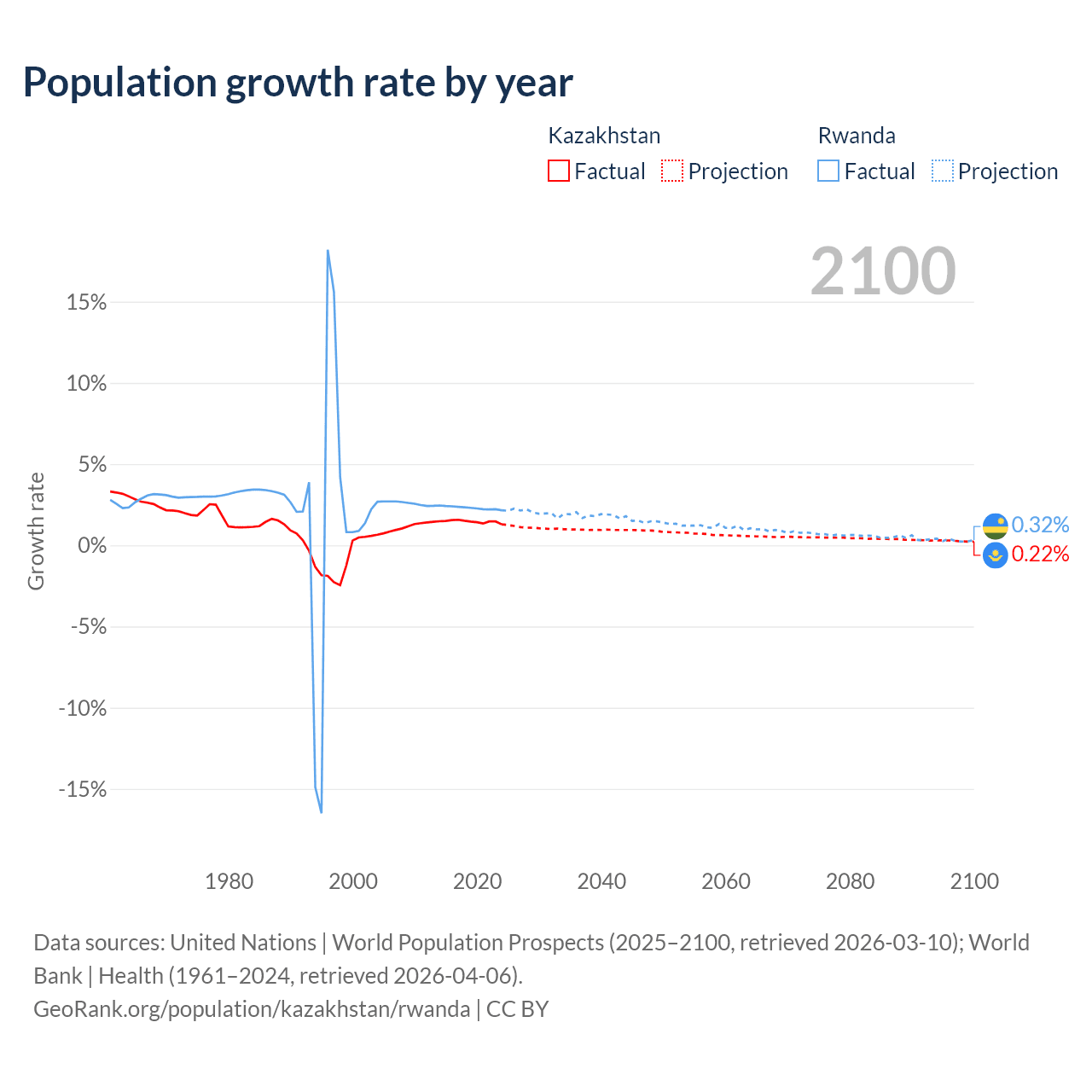 - For the last 10 years, Kazakhstan has had an average growth rate of +1.46% per year vs +2.31% in Rwanda.