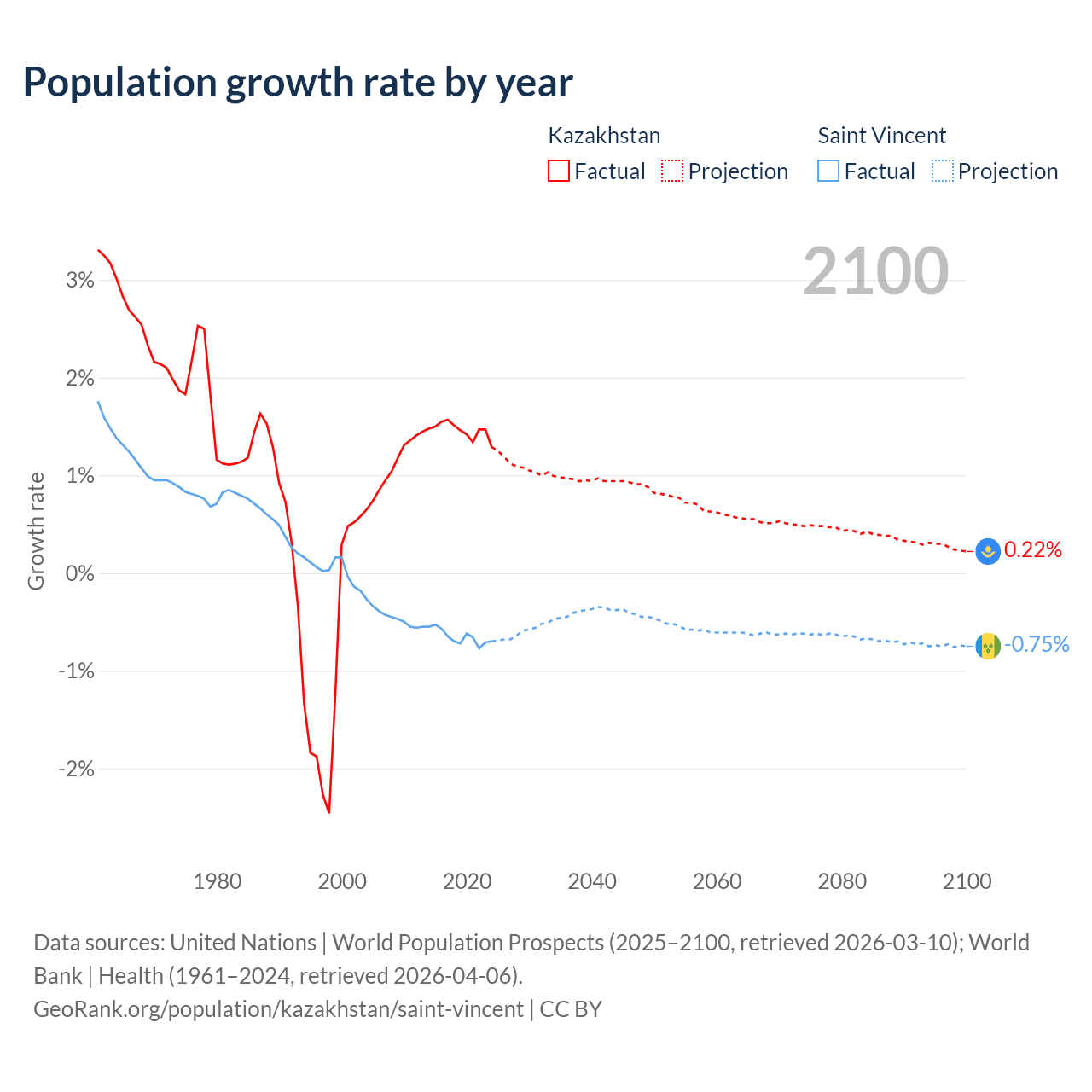 - For the last 10 years, Kazakhstan has had an average growth rate of +1.46% per year vs -0.65% in Saint Vincent.