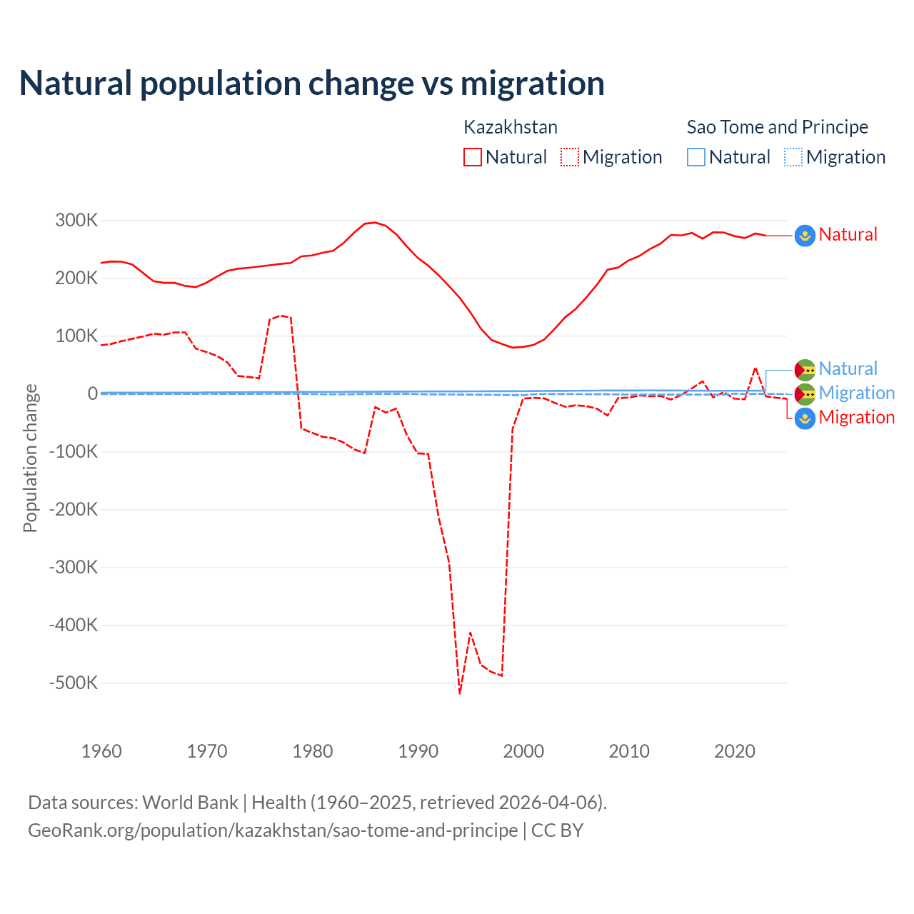 Over the last 10 years, 98.7% of the population change in Kazakhstan is from natural causes (a gain of 2,743,094 people) and 1.33% is from migration (a gain of 36,908 people). In Sao Tome and Principe 80.1% is from natural causes (a gain of 50,822 people) and 19.9% is from migration (a loss of 12,621 people).