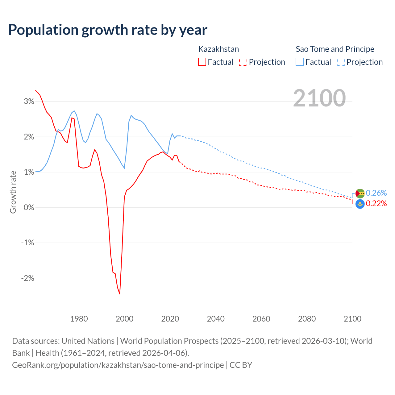 - For the last 10 years, Kazakhstan has had an average growth rate of +1.46% per year vs +1.82% in Sao Tome and Principe.