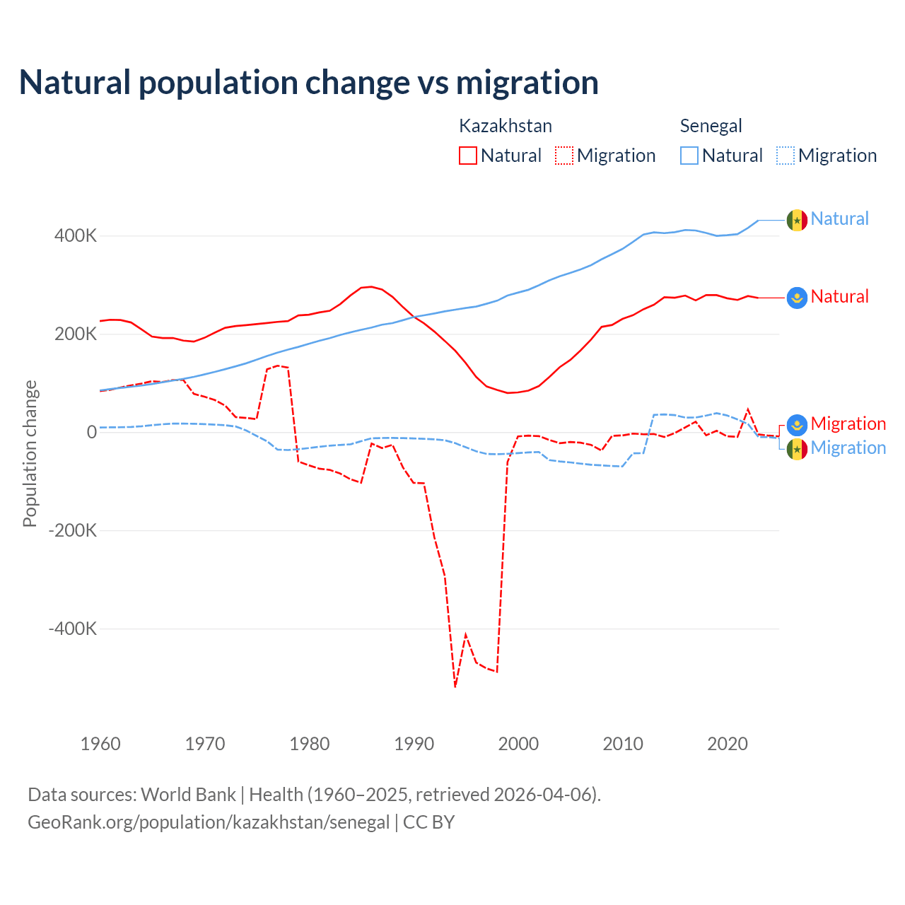 Over the last 10 years, 98.7% of the population change in Kazakhstan is from natural causes (a gain of 2,743,094 people) and 1.33% is from migration (a gain of 36,908 people). In Senegal 93.9% is from natural causes (a gain of 4,089,205 people) and 6.13% is from migration (a gain of 267,266 people).