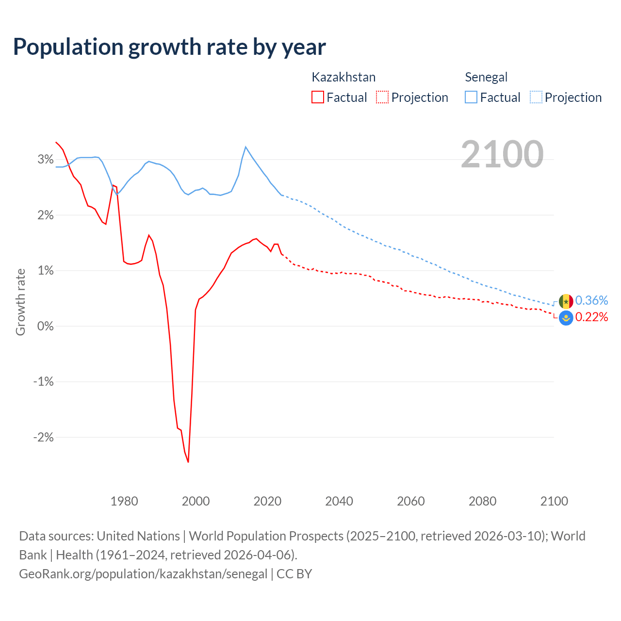 - For the last 10 years, Kazakhstan has had an average growth rate of +1.46% per year vs +2.76% in Senegal.