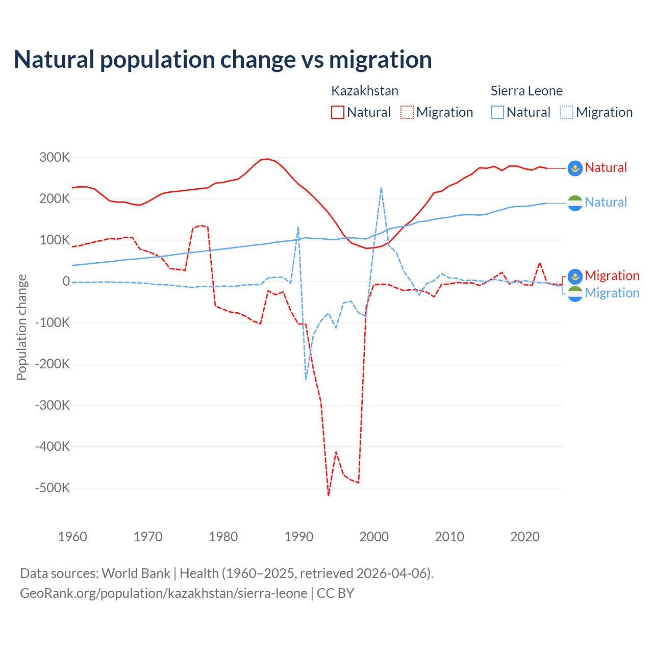 Over the last 10 years, 98.7% of the population change in Kazakhstan is from natural causes (a gain of 2,743,094 people) and 1.33% is from migration (a gain of 36,908 people). In Sierra Leone 99.6% is from natural causes (a gain of 1,764,049 people) and 0.41% is from migration (a loss of 7,211 people).