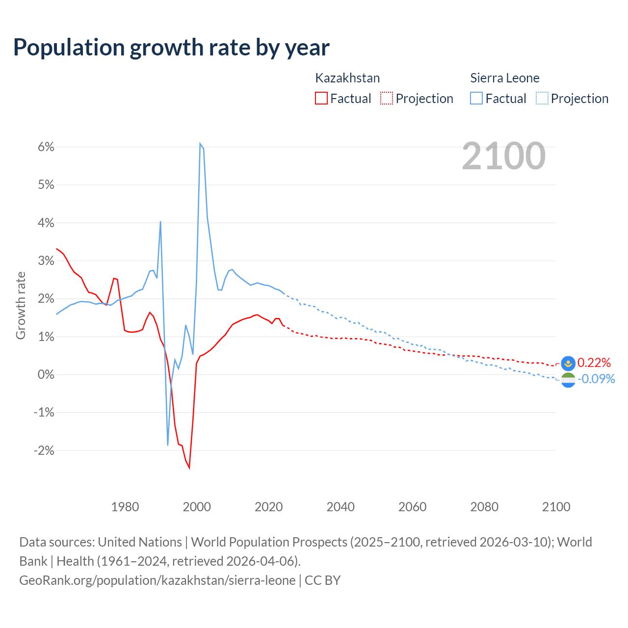 - For the last 10 years, Kazakhstan has had an average growth rate of +1.46% per year vs +2.32% in Sierra Leone.