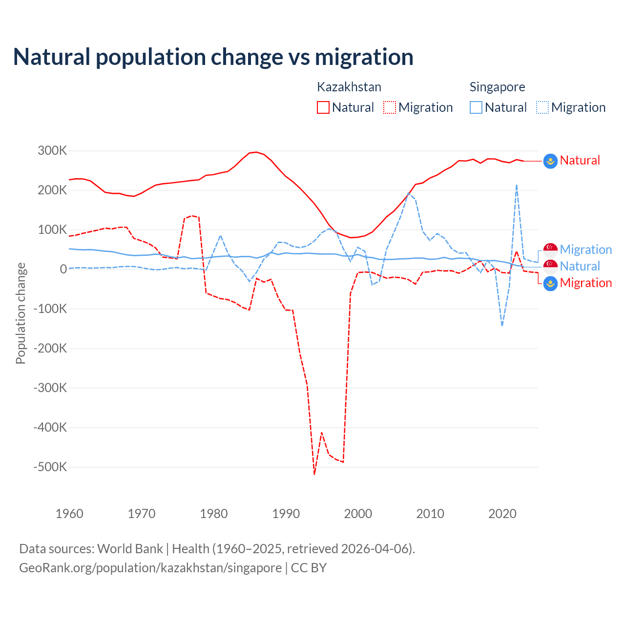 Over the last 10 years, 98.7% of the population change in Kazakhstan is from natural causes (a gain of 2,743,094 people) and 1.33% is from migration (a gain of 36,908 people). In Singapore 54.8% is from natural causes (a gain of 195,953 people) and 45.2% is from migration (a gain of 161,805 people).