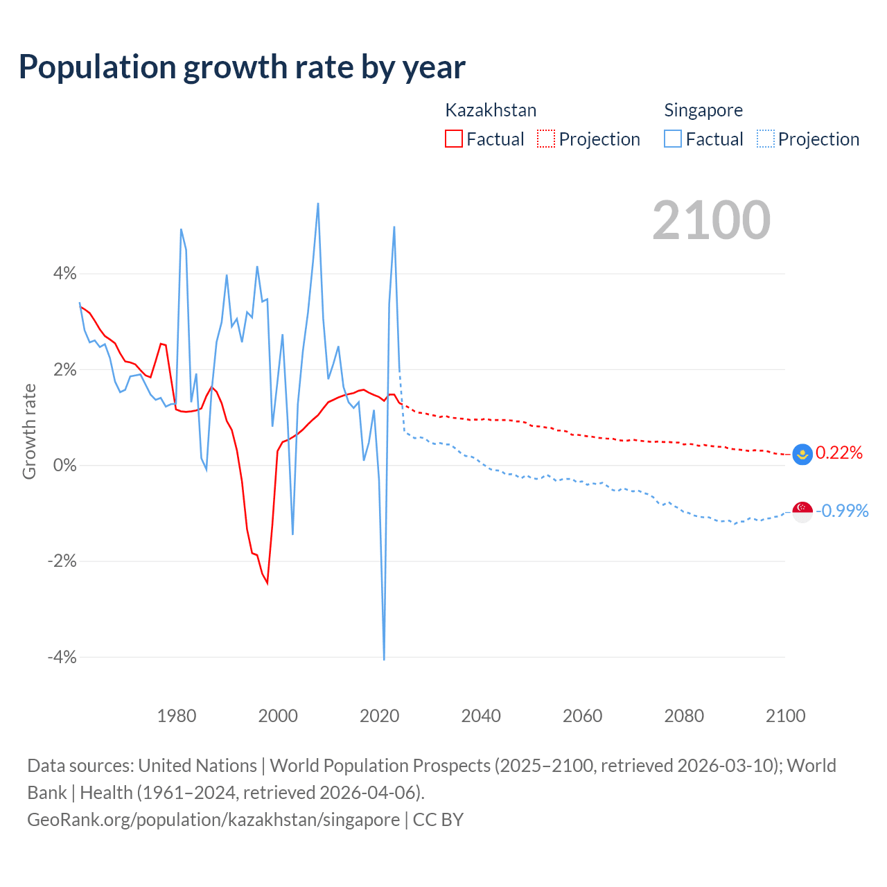 - For the last 10 years, Kazakhstan has had an average growth rate of +1.46% per year vs +1.04% in Singapore.