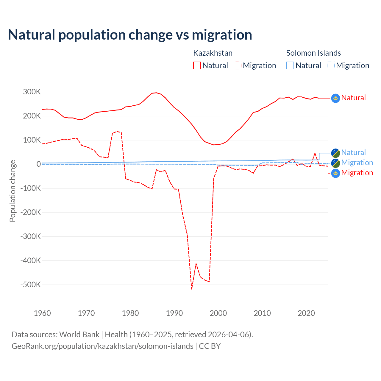 Over the last 10 years, 98.7% of the population change in Kazakhstan is from natural causes (a gain of 2,743,094 people) and 1.33% is from migration (a gain of 36,908 people). In the Solomon Islands 82.8% is from natural causes (a gain of 168,727 people) and 17.2% is from migration (a gain of 35,031 people).