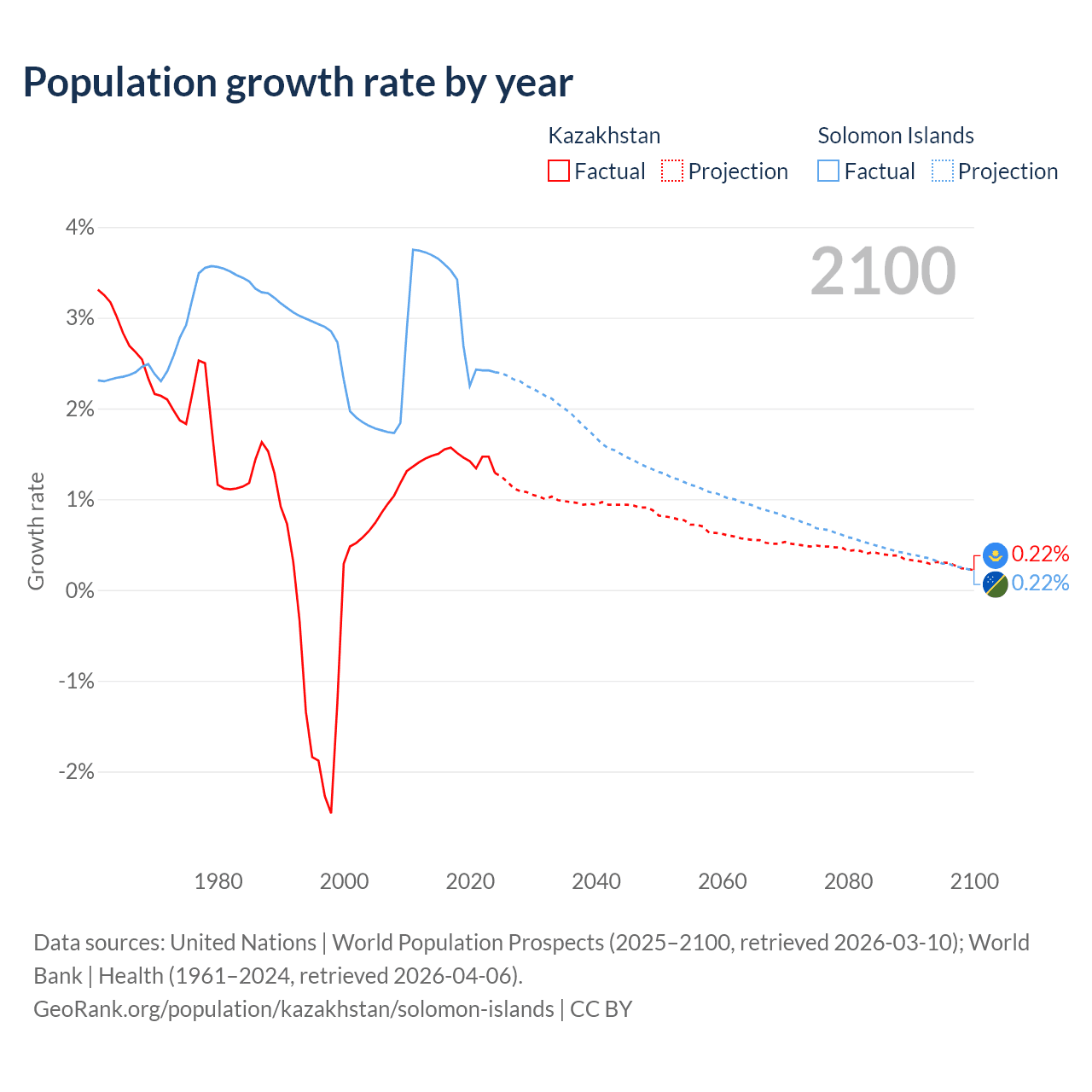 - For the last 10 years, Kazakhstan has had an average growth rate of +1.46% per year vs +2.95% in the Solomon Islands.