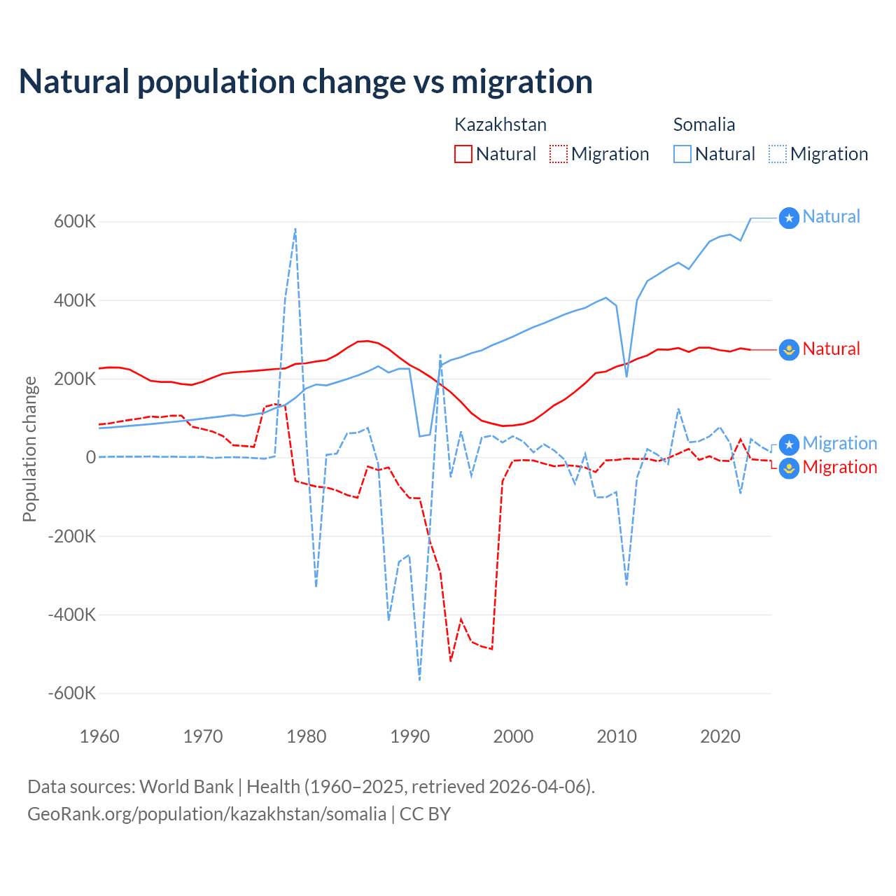 Over the last 10 years, 98.7% of the population change in Kazakhstan is from natural causes (a gain of 2,743,094 people) and 1.33% is from migration (a gain of 36,908 people). In Somalia 94.4% is from natural causes (a gain of 5,270,105 people) and 5.58% is from migration (a gain of 311,487 people).