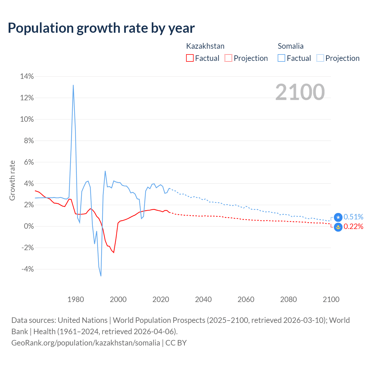 - For the last 10 years, Kazakhstan has had an average growth rate of +1.46% per year vs +3.61% in Somalia.
