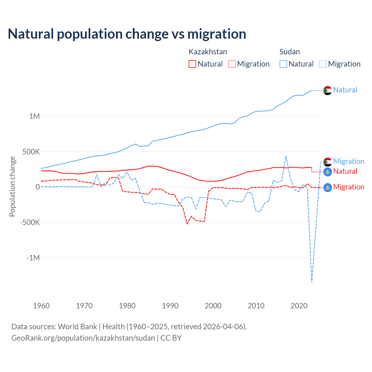 Over the last 10 years, 98.7% of the population change in Kazakhstan is from natural causes (a gain of 2,743,094 people) and 1.33% is from migration (a gain of 36,908 people). In Sudan 95.1% is from natural causes (a gain of 12,459,977 people) and 4.88% is from migration (a loss of 639,596 people).