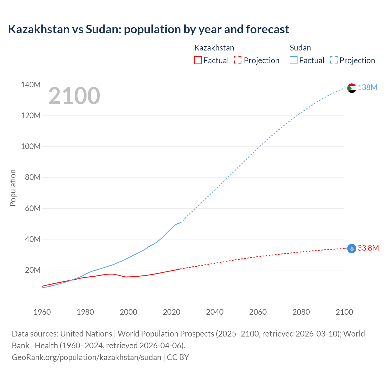 The latest officially reported population of Kazakhstan was 20,592,571 in 2024 vs 50,448,963 people in Sudan in 2024. In 2026, based on the adjusted UN estimation, the current Kazakhstan's population is 21,161,809 people compared to 53,335,233 in Sudan.