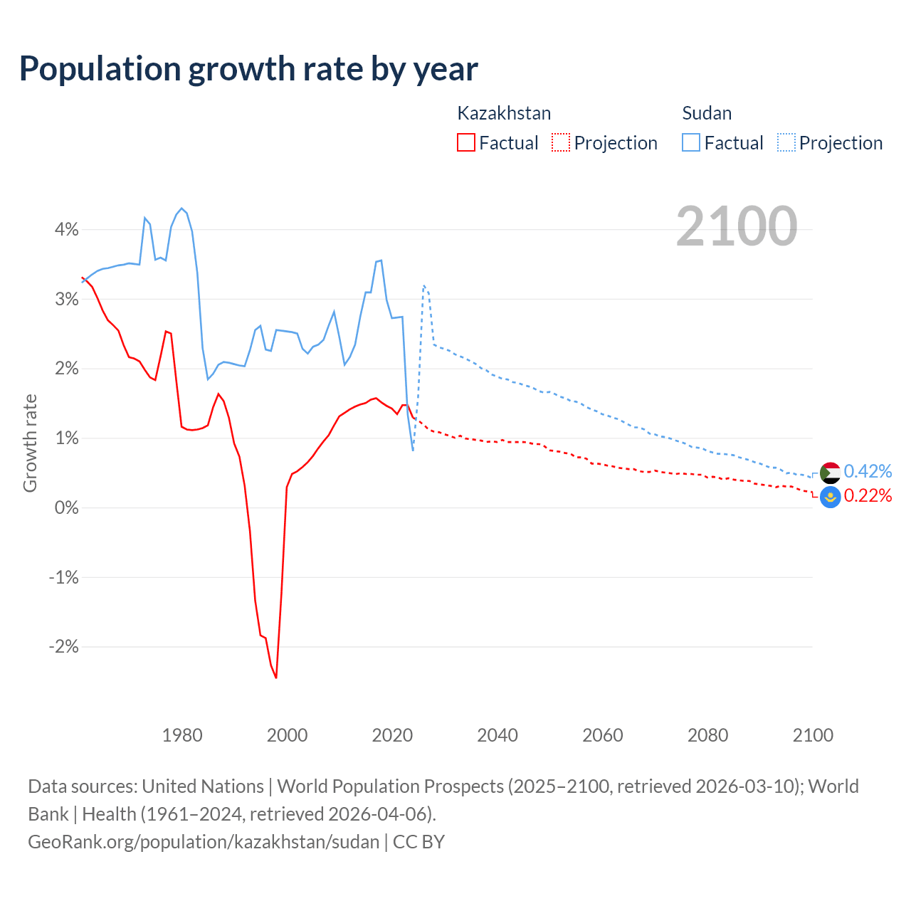 - For the last 10 years, Kazakhstan has had an average growth rate of +1.46% per year vs +2.67% in Sudan.