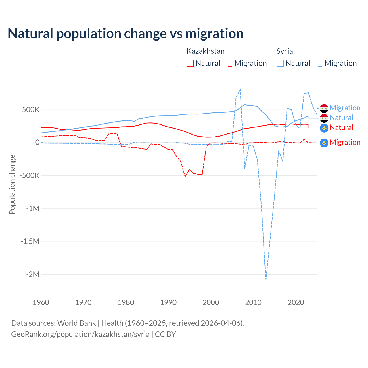 Over the last 10 years, 98.7% of the population change in Kazakhstan is from natural causes (a gain of 2,743,094 people) and 1.33% is from migration (a gain of 36,908 people). In Syria 91.3% is from natural causes (a gain of 3,047,621 people) and 8.72% is from migration (a gain of 291,069 people).